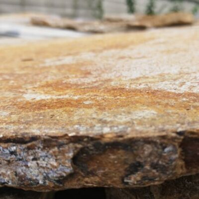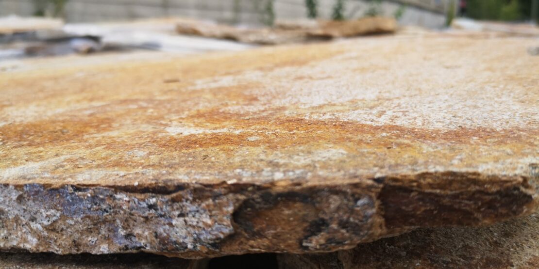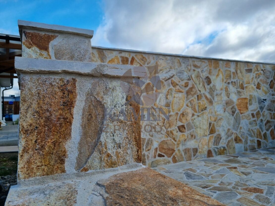 Nepravidelný zlatohnědý velkoformátový obklad z kamene u nás můžete zakoupit pouze po ucelených paletách. Přijďte se k nám podívat. Zakoupený kámen Vám rádi přivezeme kamkoliv po celé ČR.