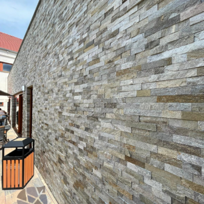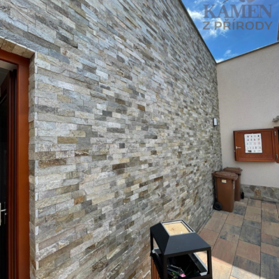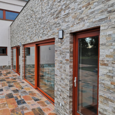 Fasáda domu je obložena béžovými řezanými páskami s výškou 5 cm v kombinaci s béžovým nepravidelným velkoformátovým obkladem na soklu a terasách.
