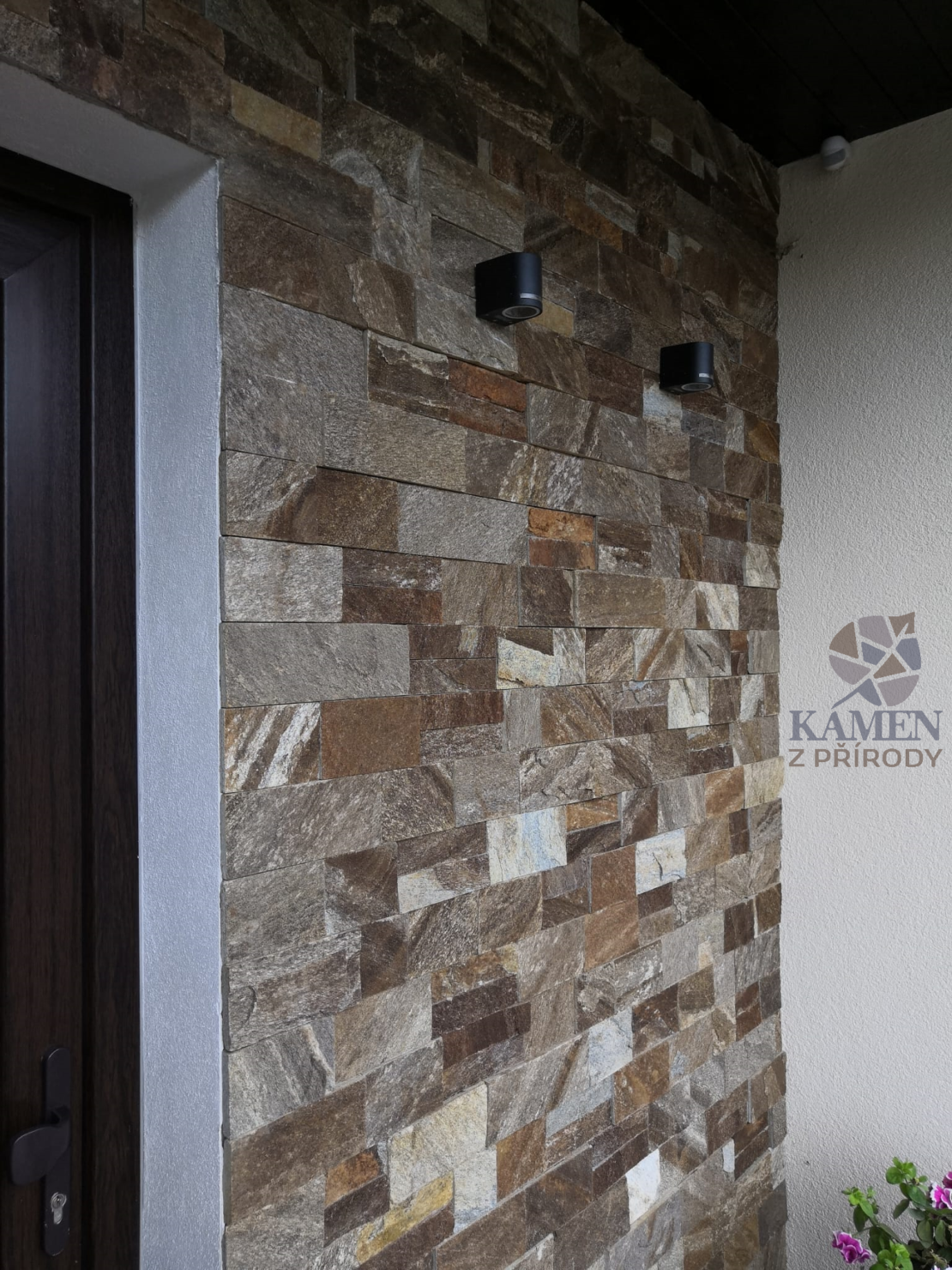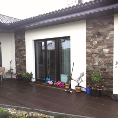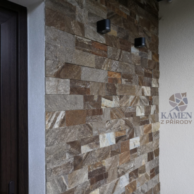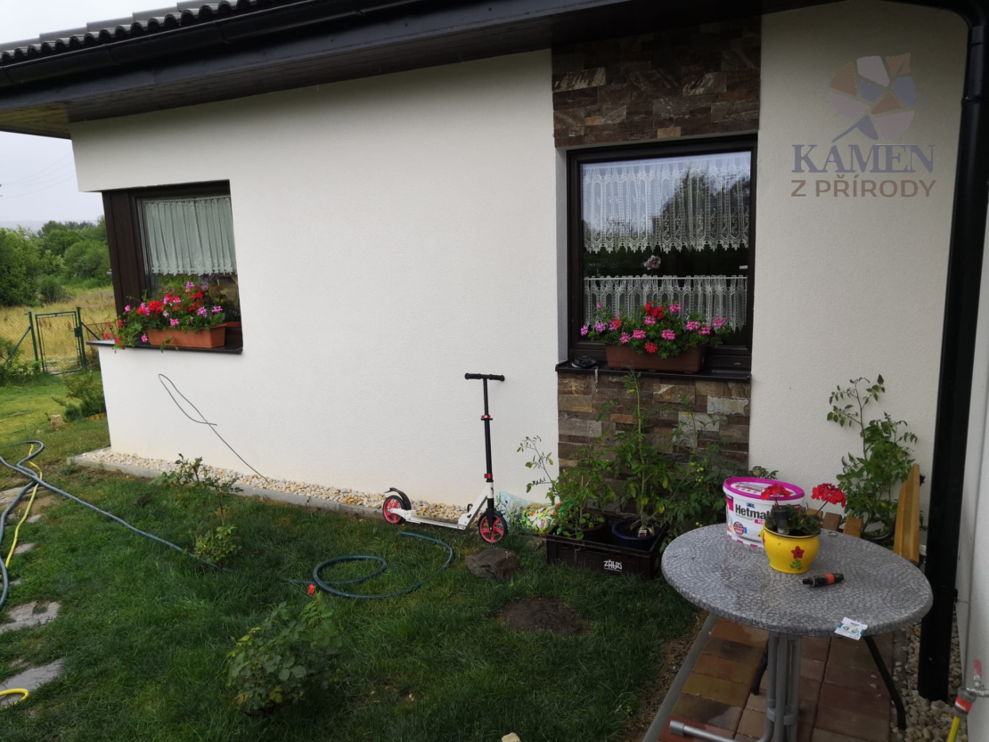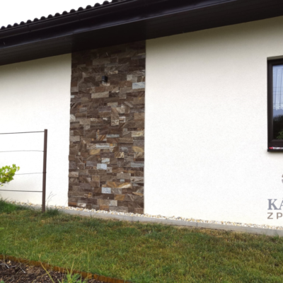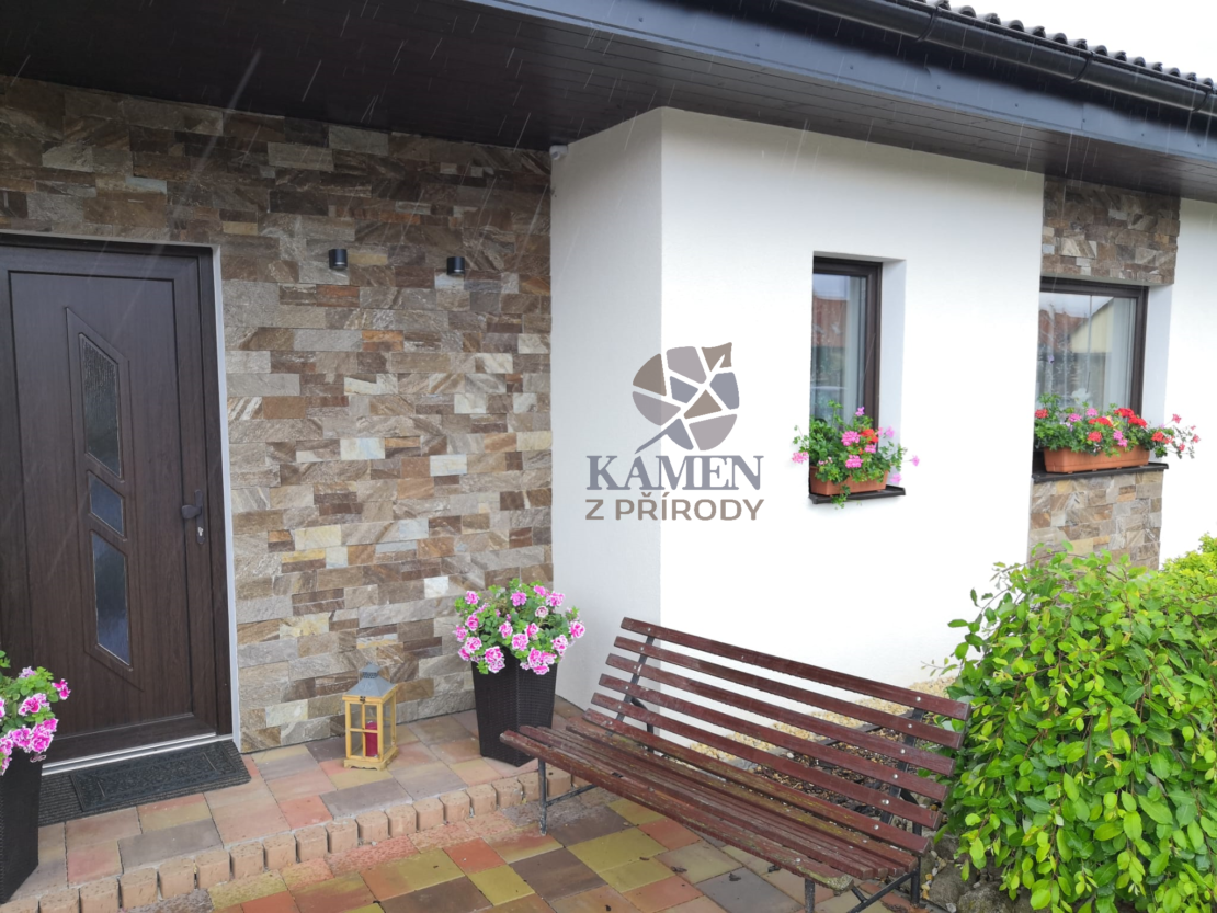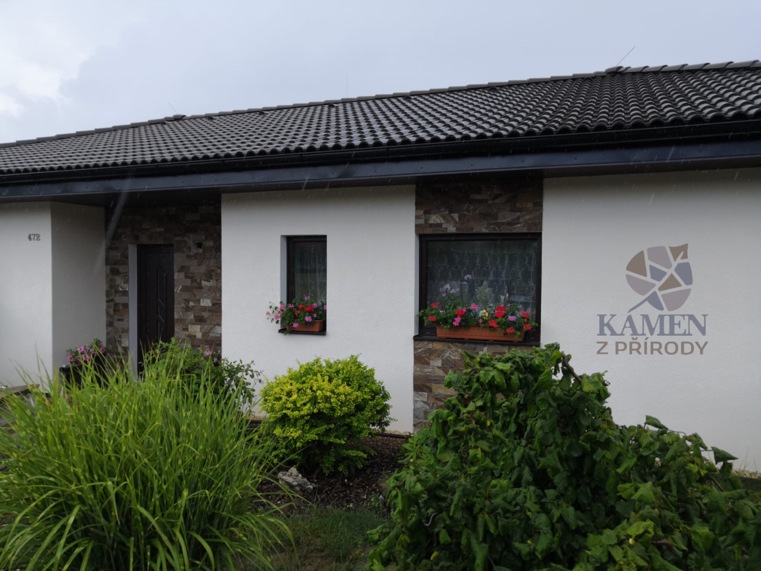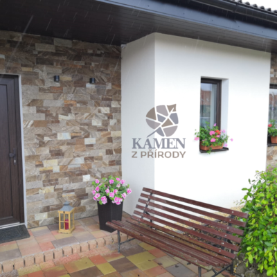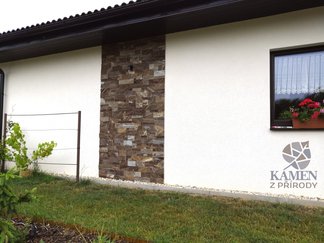 Fasáda domu je obložena hnědými kamennými páskami o výšce 5 a 10 cm.