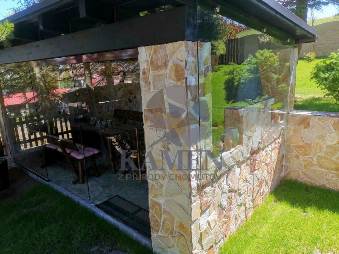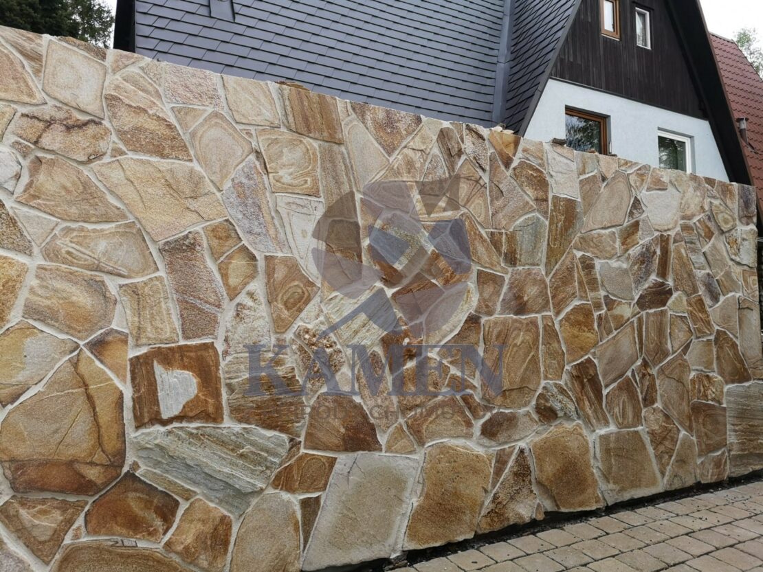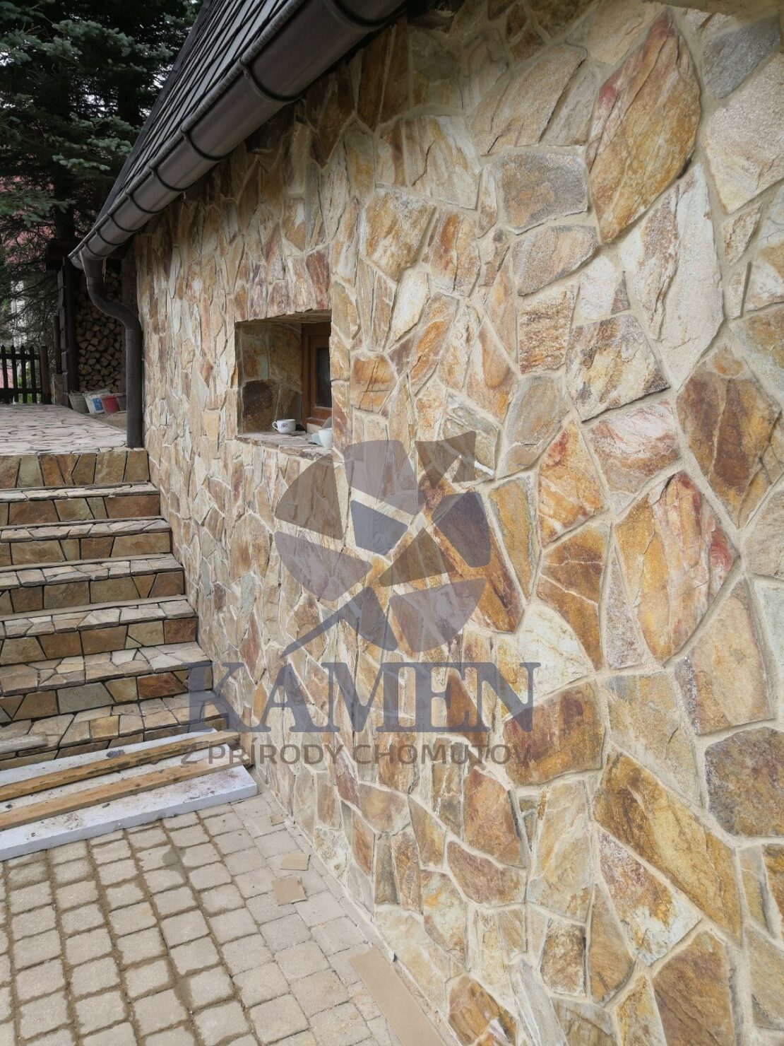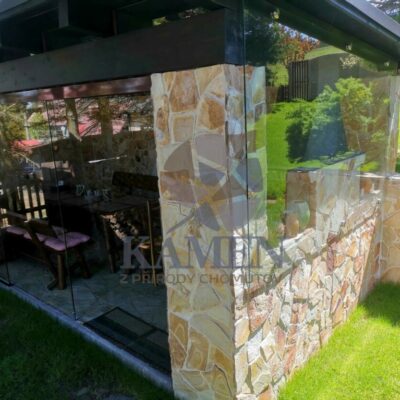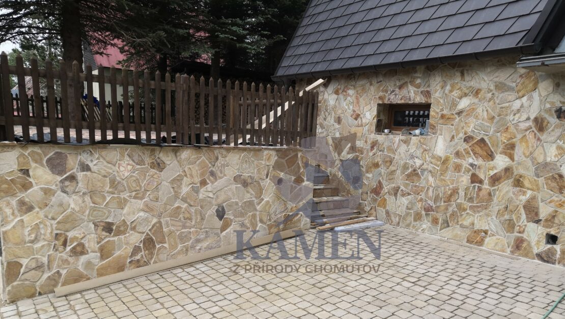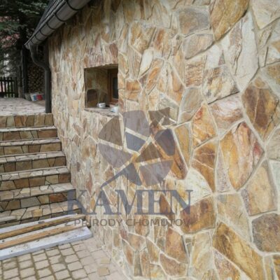 Fasáda domu je obložena velkoformátovým zlatým obkladem, který je spárovaný bílobéžovou spárovací maltou FM-X. Pochozí plochy jsou obložené nepravidelnou dlažbou ve zlaté barvě, spárovanou taktéž bílobéžovou spárovací maltou.