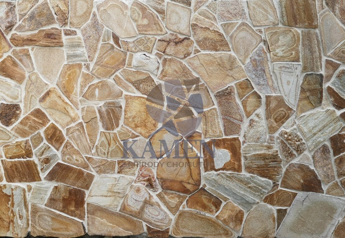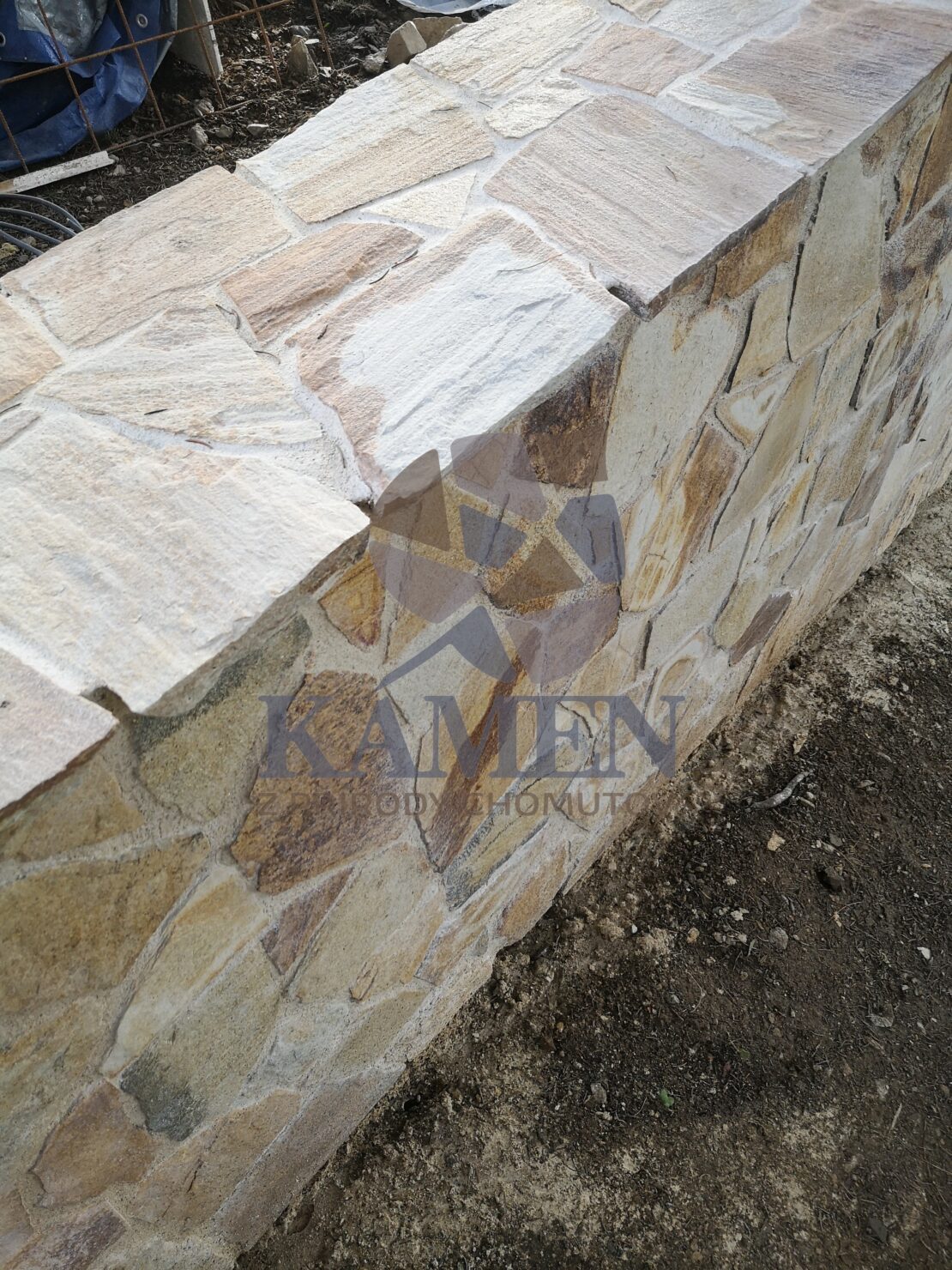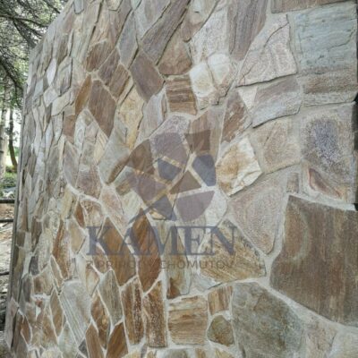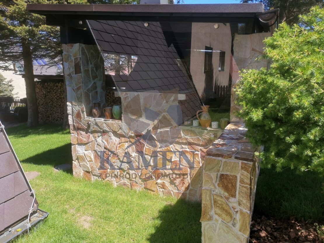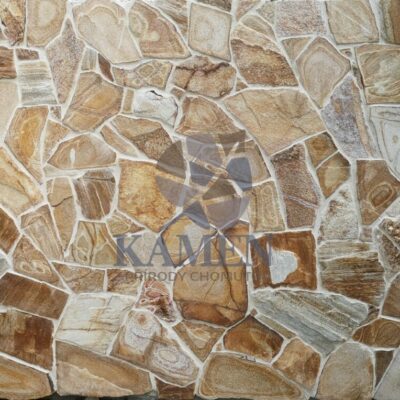 Fasáda domu je obložena velkoformátovým zlatým obkladem, který je spárovaný bílobéžovou spárovací maltou FM-X. Pochozí plochy jsou obložené nepravidelnou dlažbou ve zlaté barvě, spárovanou taktéž bílobéžovou spárovací maltou.